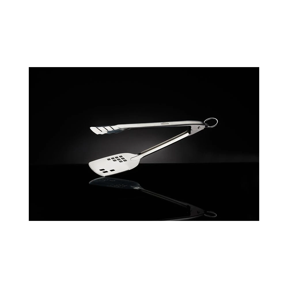 It’s the best of both worlds: Du får både tang og palet i en helt speciel sammensmeltning som er perfekt til de store stege. I enden finder du en krog til ophæng, der samtidig fungerer som en smart åben og lukke funktion. Riv ud i krogen og tangen låses – og når den skal tages i brug trykker du den blot nonchalant mod hoften hvorved tangen slås ud og er klar til brug.