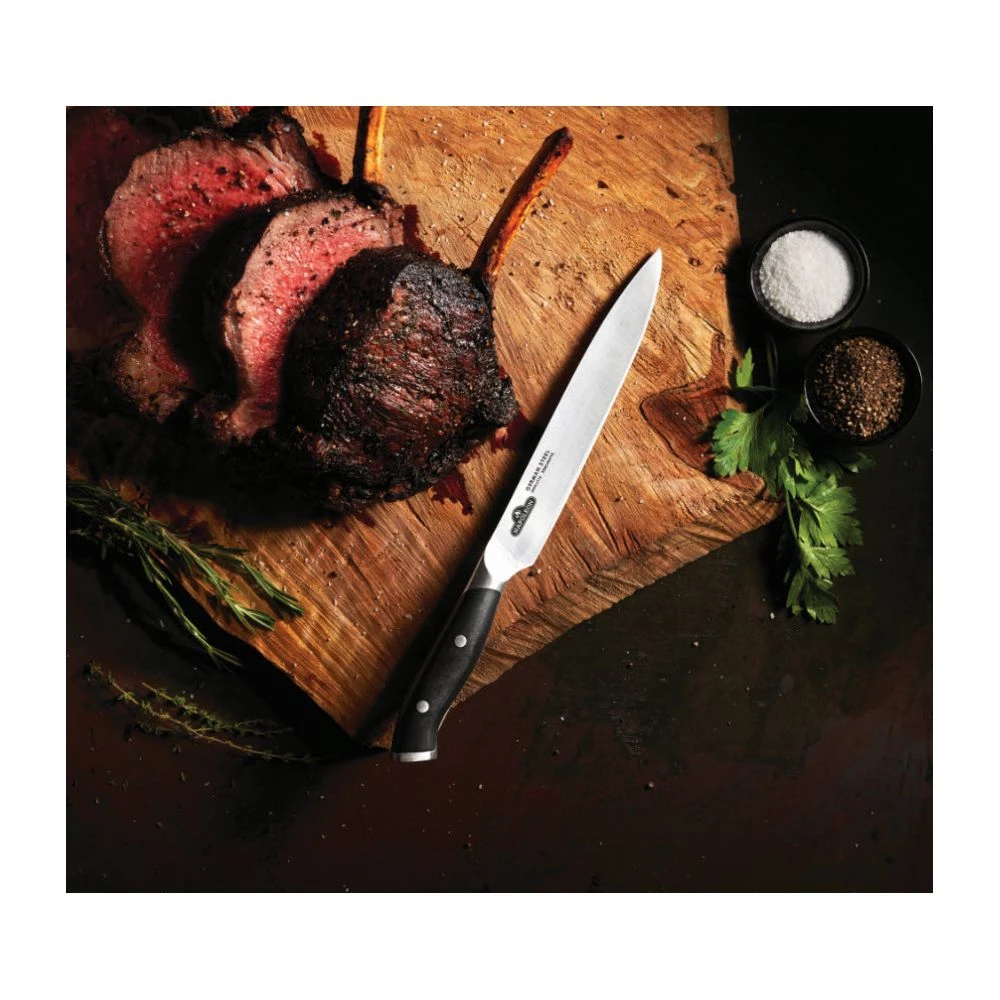 Den er lavet af rustfri stål og måler 20 cm. Bladet er tyndere end den klassiske kokkekniv, så du let kan skære fine og tynde skiver af din steg. Forskærerkniven vil derfor helt sikkert blive et hit, når menuen står på hele stege eller andre store kødudskæringer.