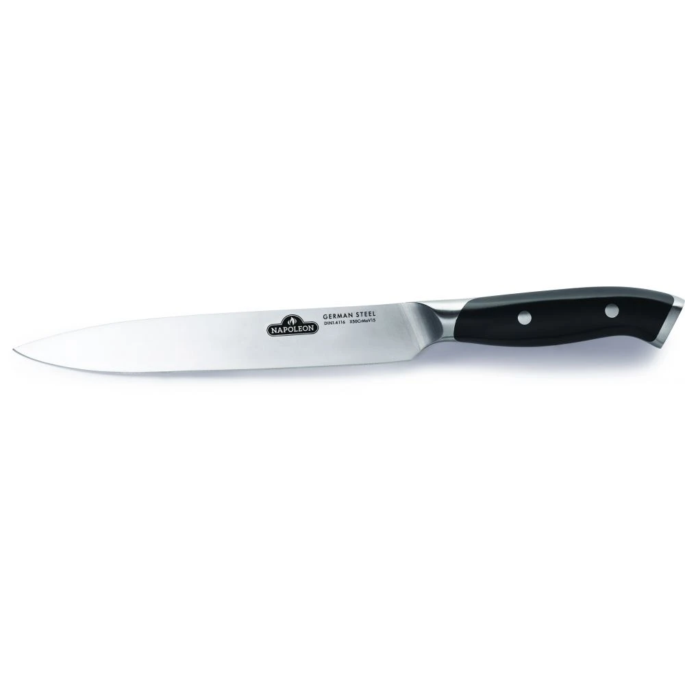 Napoleons 8-tommer Forskærerkniv er en smuk tilføjelse til din knivblok. Det smedede rustfri stål løber hele knivens længde; det er afbalanceret fra spidsen, hele vejen igennem tang.