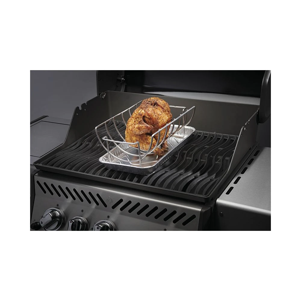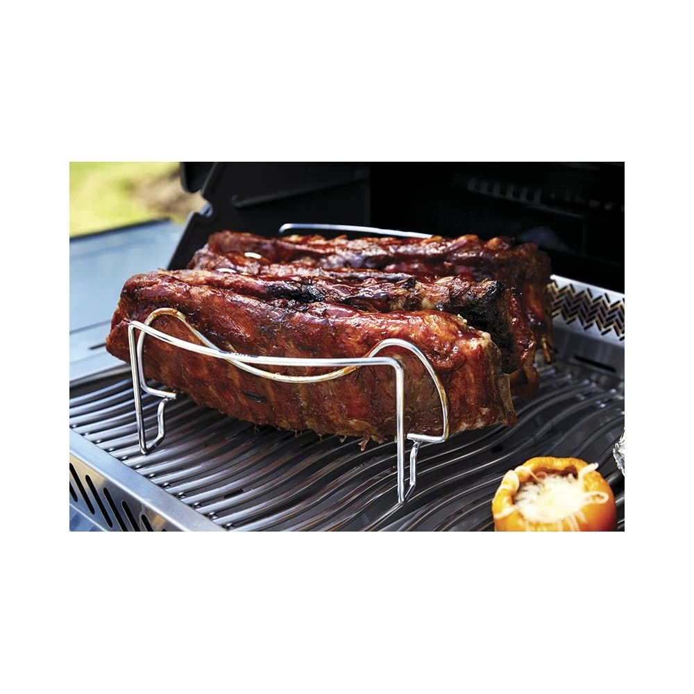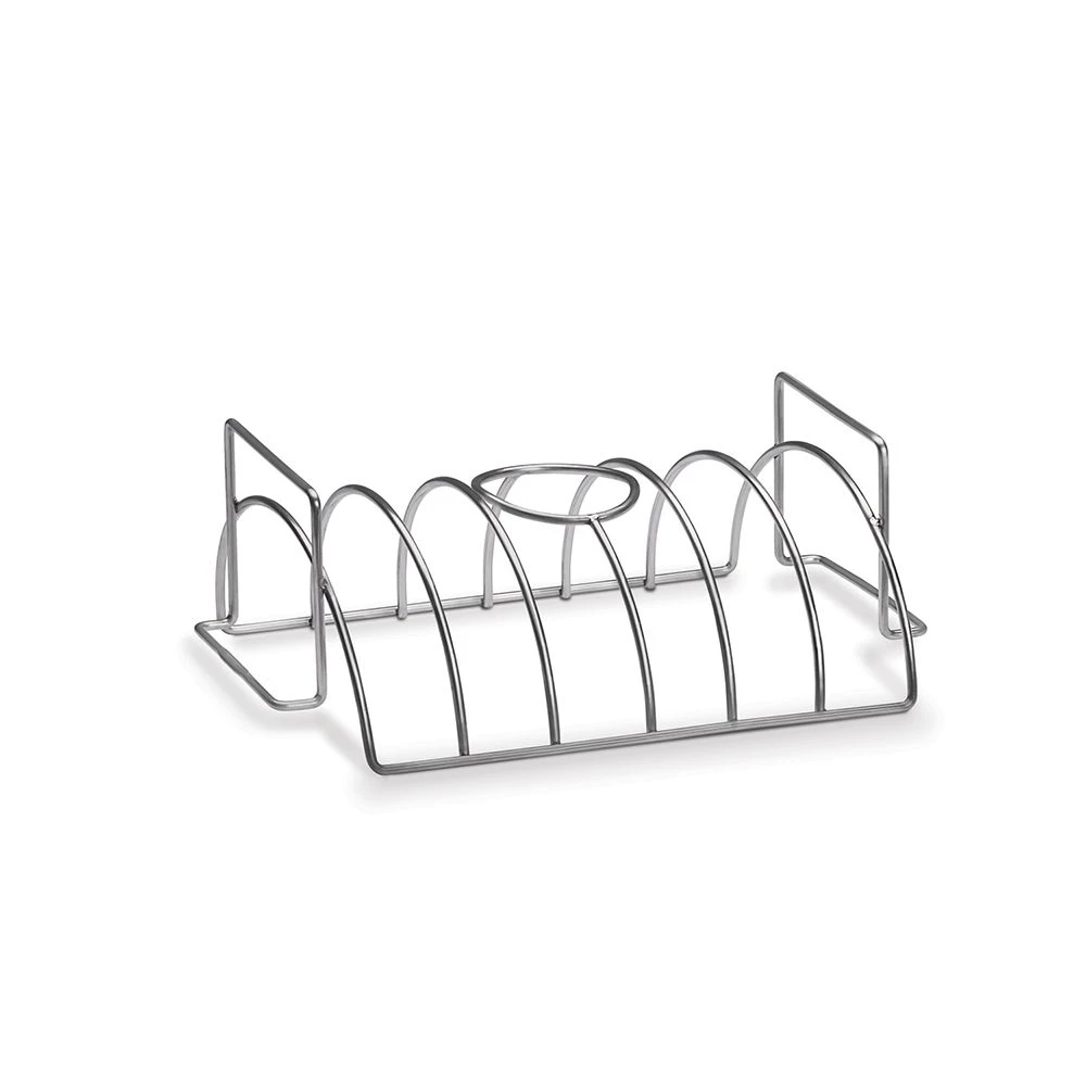 Napoleon Kyllinge- og Stegeholder er lavet i rustfri stål og er nemt at rengøre. Den har et vendbart design, så der er flere anvendelsesmetoder. Stativet har håndtag i begge sider, der gør det nemt at få den af og på grillen – husk grillhandsker, da stativet bliver varmt. Der er plads til fire ribs, en steg eller en kylling.