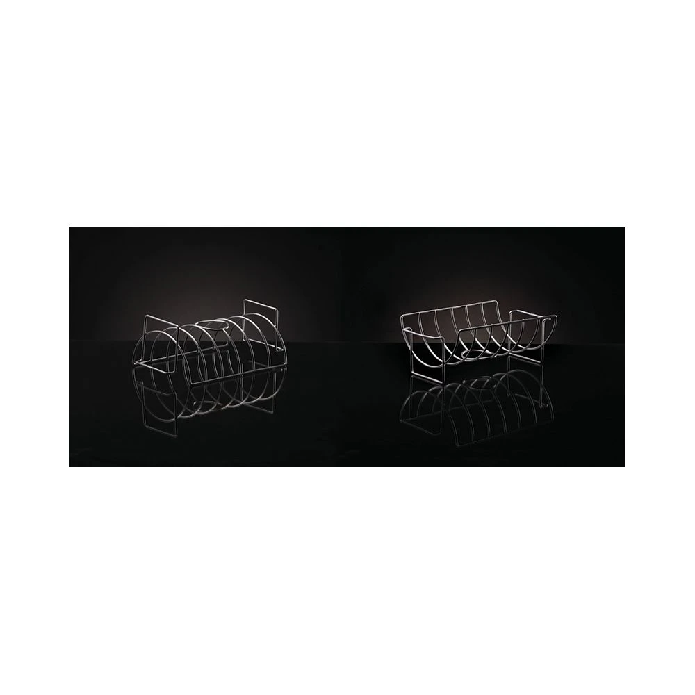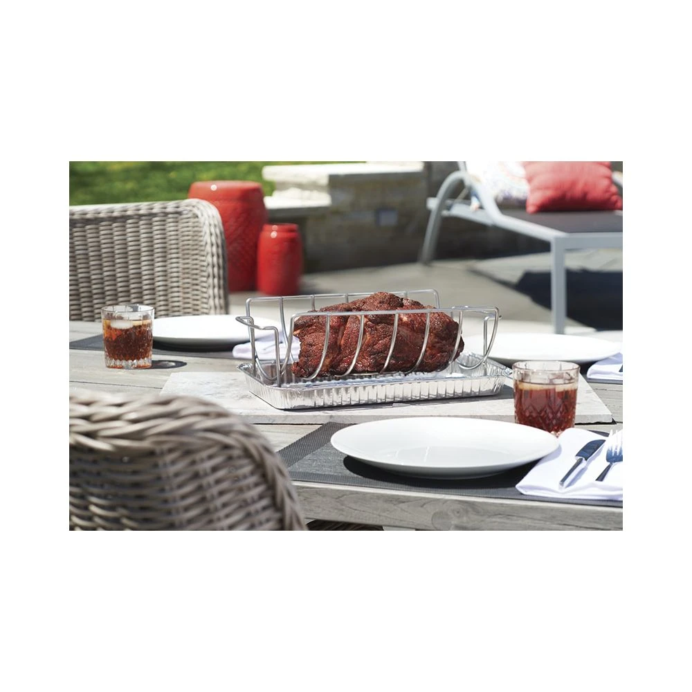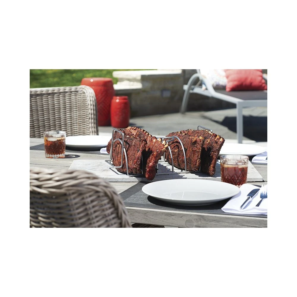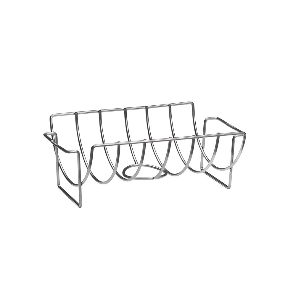 Napoleon Kyllinge- og Stegeholder er lavet i rustfri stål og er nemt at rengøre. Den har et vendbart design, så der er flere anvendelsesmetoder. Stativet har håndtag i begge sider, der gør det nemt at få den af og på grillen – husk grillhandsker, da stativet bliver varmt. Der er plads til fire ribs, en steg eller en kylling.
