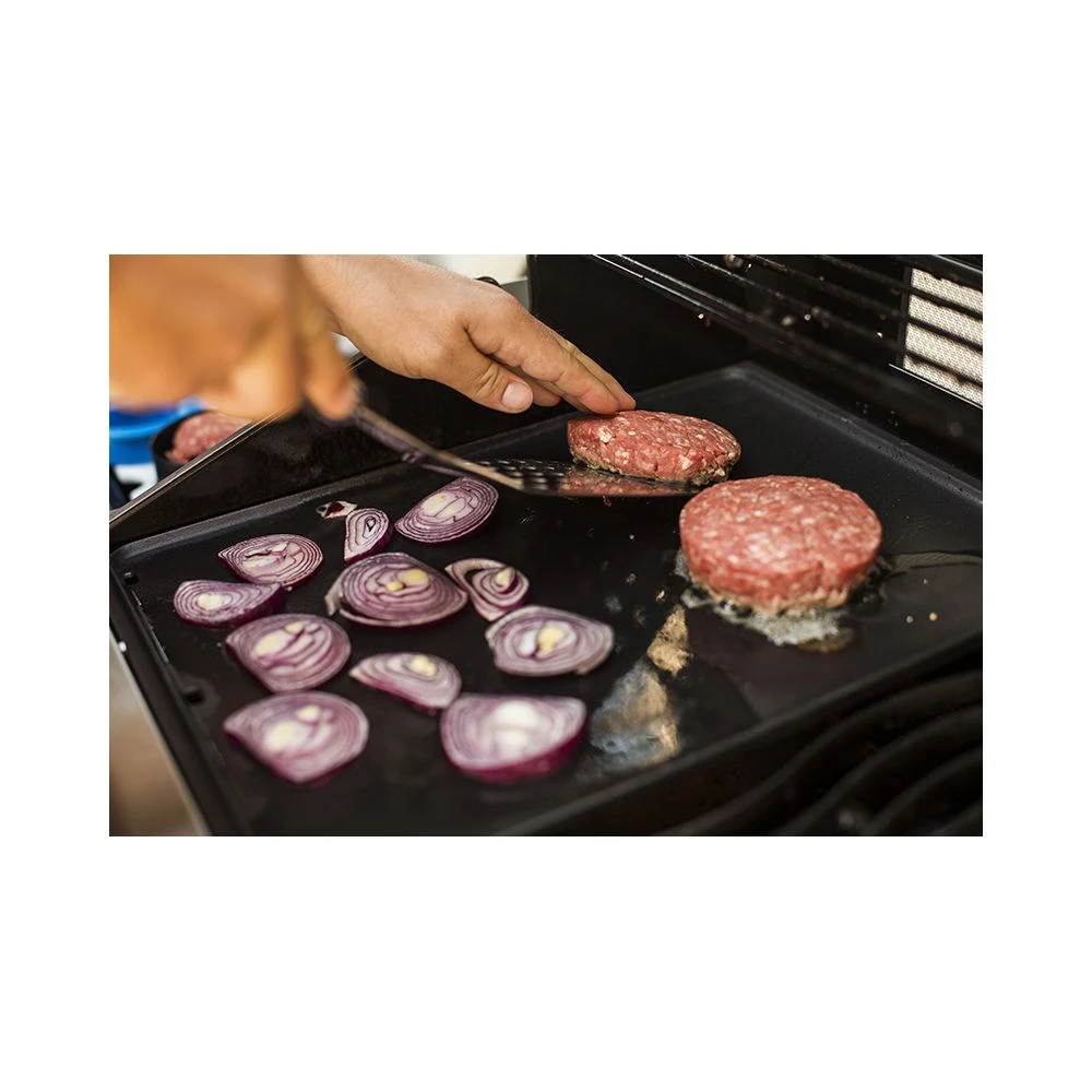 Fra dit komfur kender du pladen som en grillpande og grillpladen i støbejern kan lave det hele. Den flade side fungerer suverænt til sydende bacon, spejlæg, kartofler, karamelliserede løg, brunch-pølser, pandekager mv. mens den rillede side giver Napoleons fine Wave-stegestreger samtidig med at fedtet let kan løbe fra dine frikadeller, nakkekorteletter eller måske hakkebøfferne til din grillede burger.