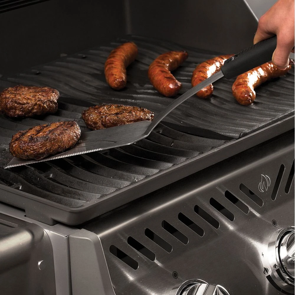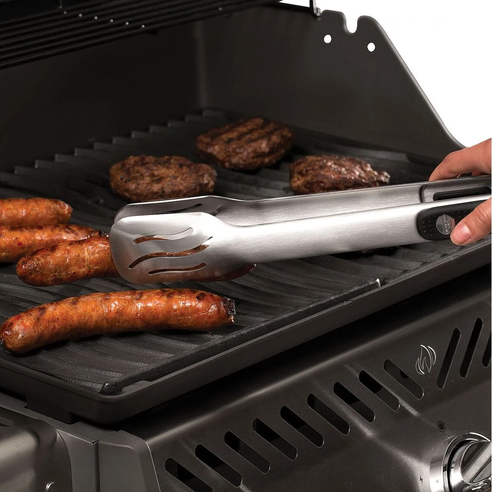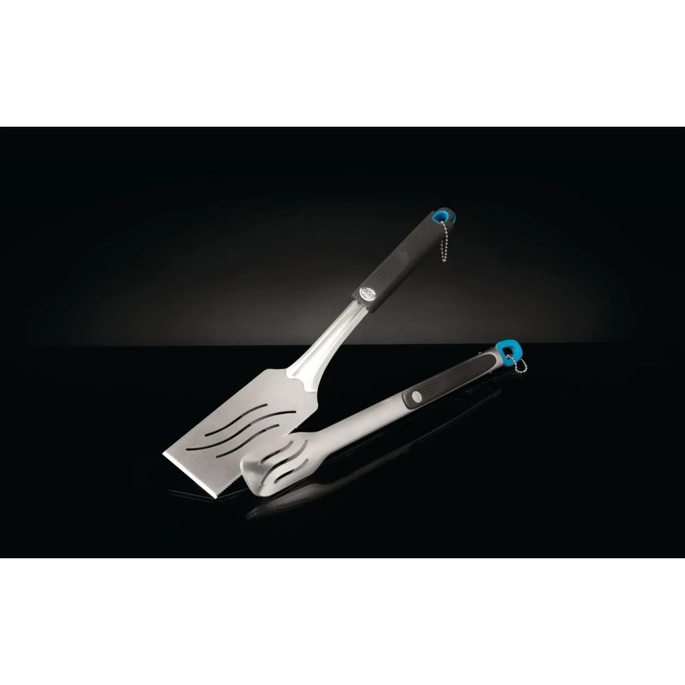 Den ekstra lange spatel vil let vende og omdanne alt hvad du ønsker at grille, nemt at styre mad med sin kantede kant og bladet spids. Trækfligen på tængerne låses nemt og låser op, og begge grillværktøjer kan nemt opbevares takket være de indbyggede værktøjsbøjler.