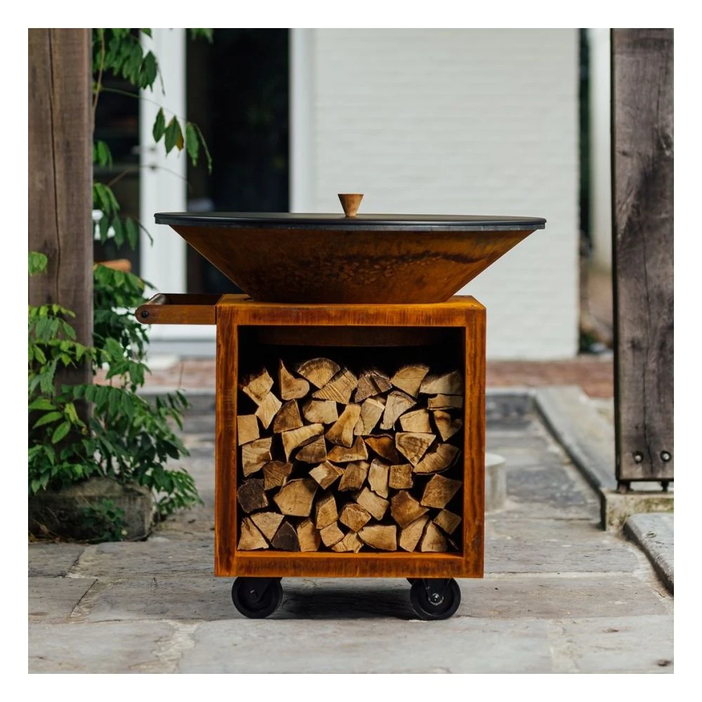 Klassisk OFYR PRO i Corten med plads til opbevaring af brænde i hulrummet. Dette OFYR Classic Corten PRO har alle funktioner og karakteristika som et klassiske OFYR, men med hjul som en ekstra unik detalje, der gør det nemt at flytte dit OFYR lige derhen, hvor det skal bruges. Fyr op i grillen og mærk suset af hvordan ethvert event kan gøres helt speciel. Håndtaget er lavet i teaktræ, og det anbefales derfor, at opbevare OFYR PRO indenfor eller under et halvtag for den bedst mulige pleje.