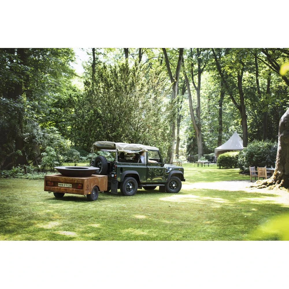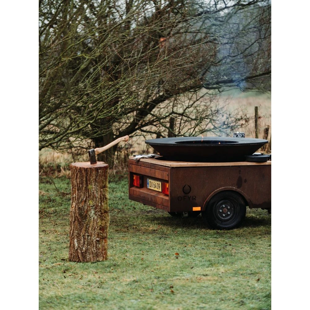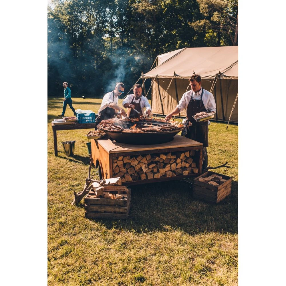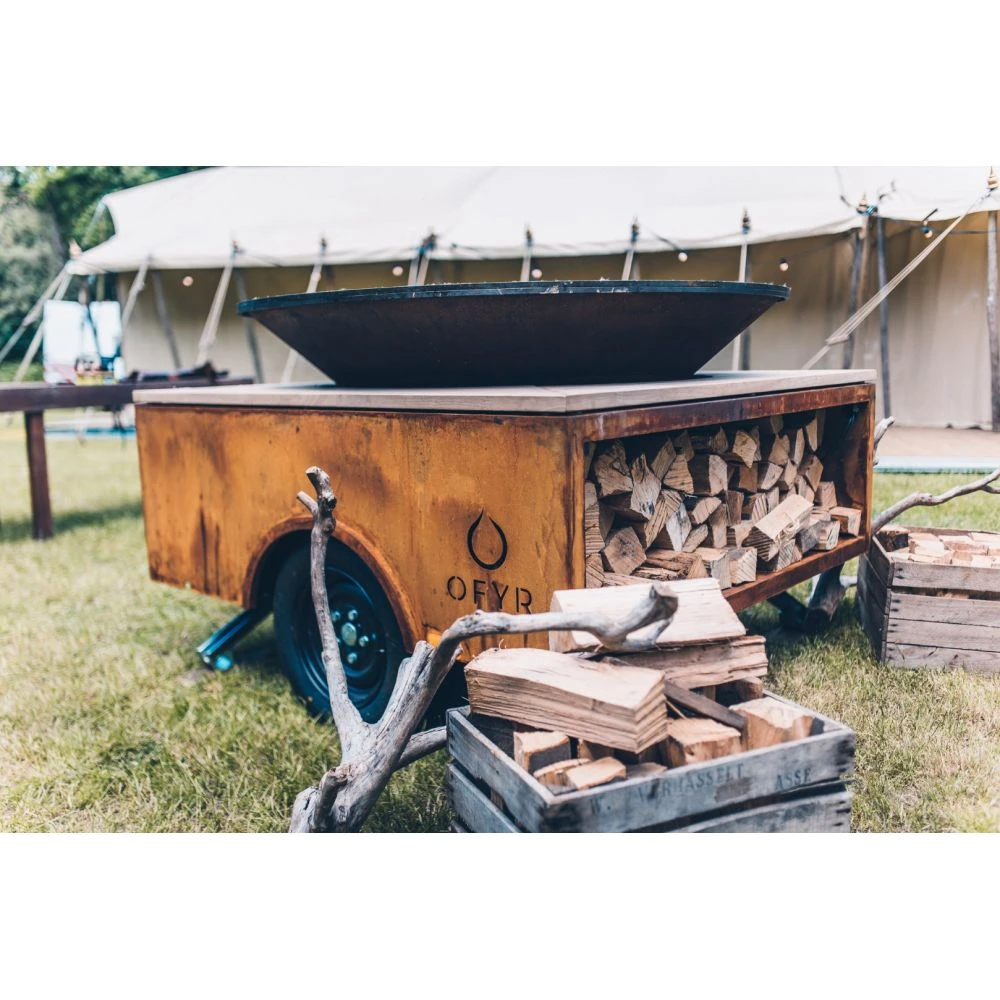 Alle OFYR produkterne kan bruges til professionelt arbejde, men denne super-size model i Corten på hjul er specielt designet til dem, som skal servere mad for store grupper af mennesker. Med en diameter på hele 150 cm er der plads til to personer ved OFYR’et samtidig, hvilket gør det muligt at lave mad for helt op til 150 mennesker på samme tid. Det helt unikke ved dette OFYR XL Trailer er hjulene, som gør det muligt at transportere OFYR’et som en trailer, samt opbevaring i både for -og bagende.