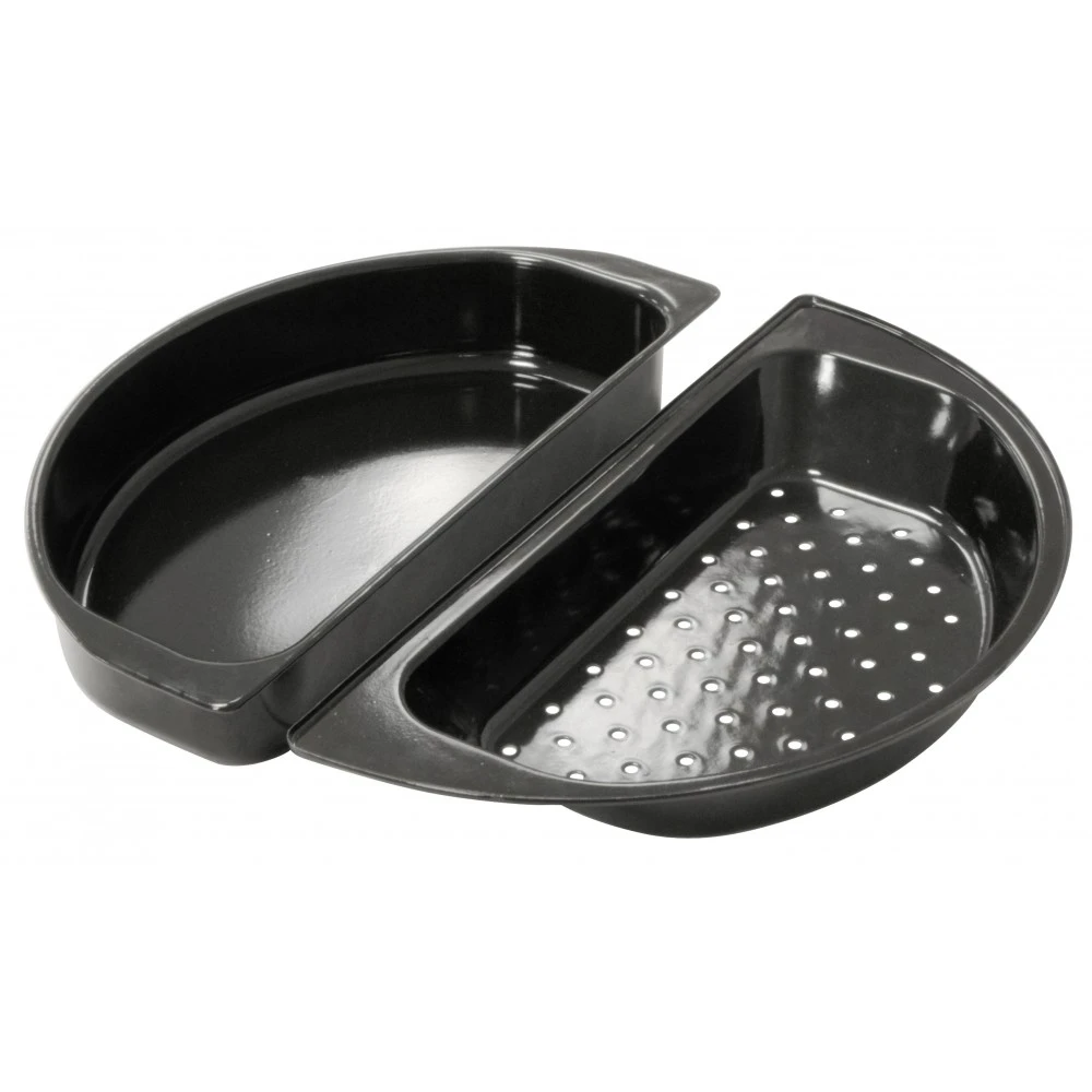 De to halvmåneformede porcelænsemaljerede gourmetskåle kan bruges sammen eller hver for sig. Mens en steg steger i sin egen saft i den ene, damper grøntsagerne i den anden.