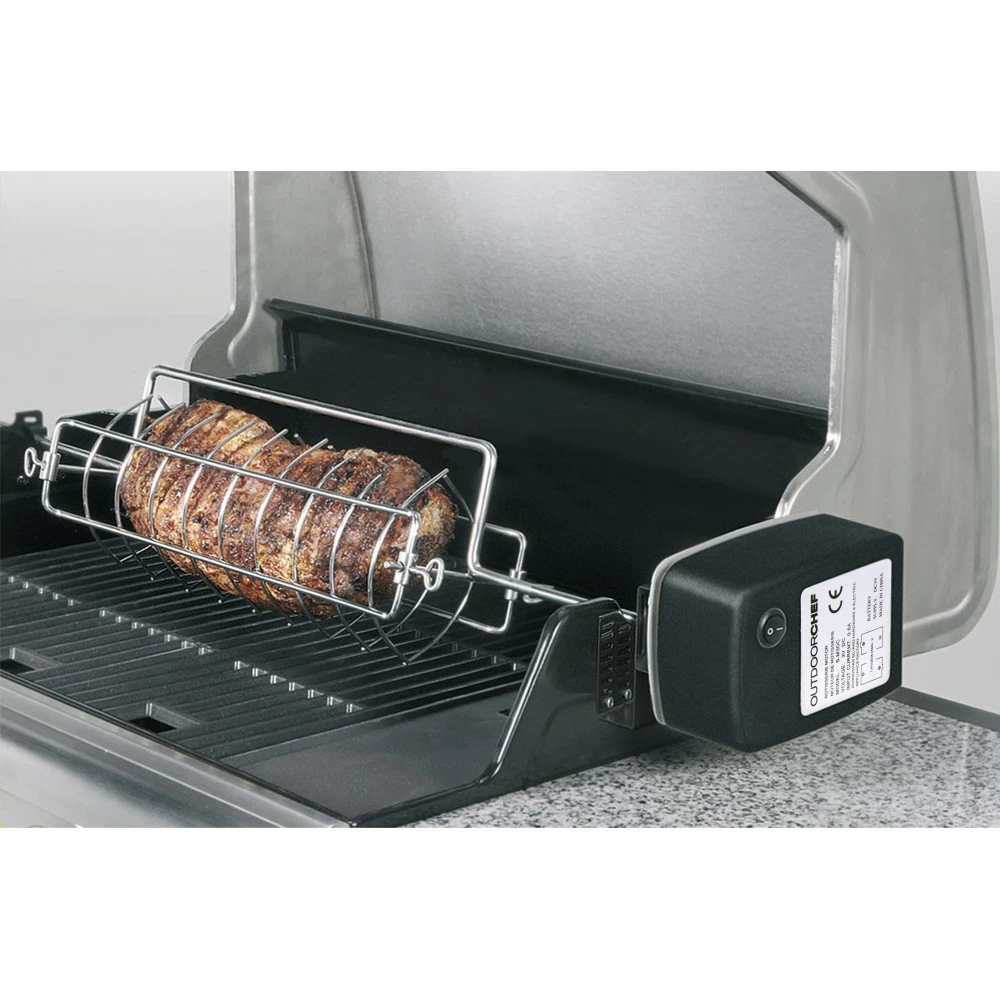 Grillmaden spiddes ikke, men holdes fast i stegekurven og holder effektivt på saften. Velegnet til søndagsstegen eller andre store stykker kød.